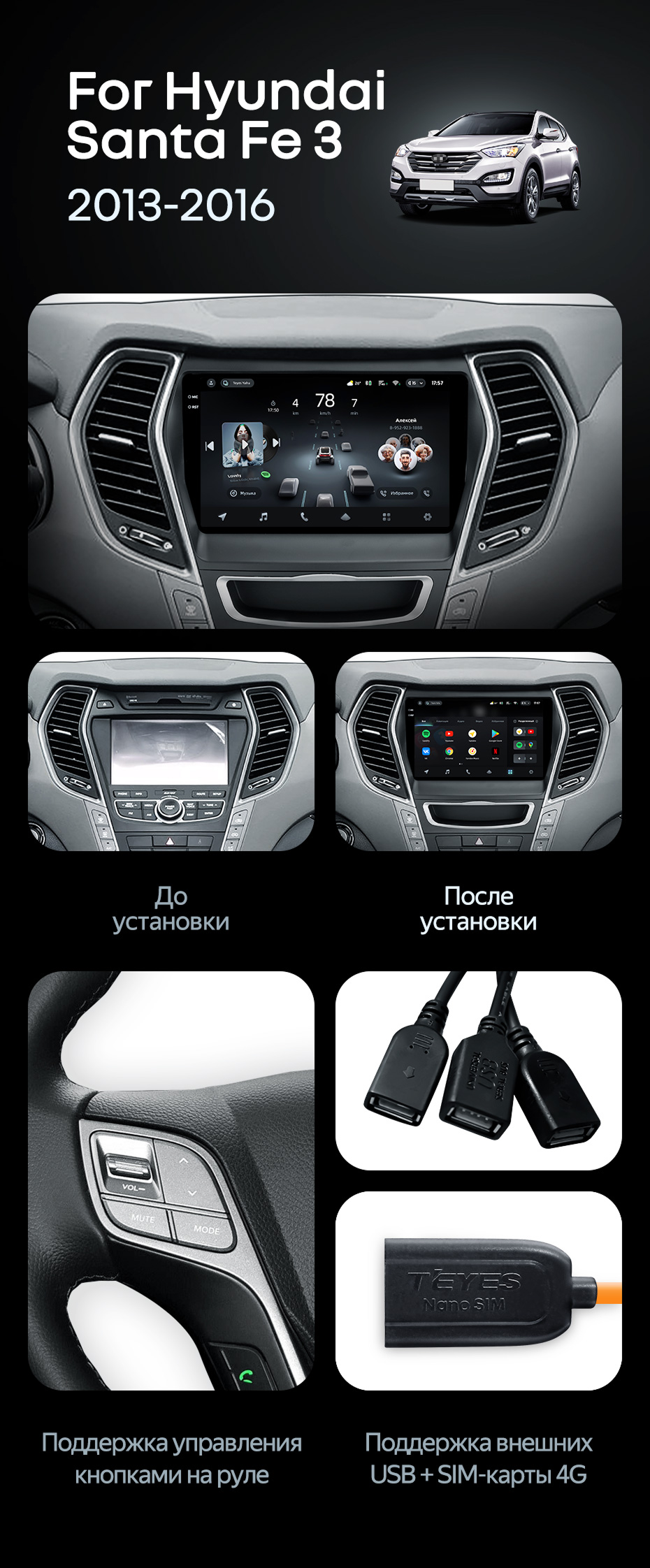 Штатная магнитола Teyes CC4 8/128 Hyundai Santa Fe 3 (2013-2016) Тип-B - купить всего за 48 420 руб. в интернет-магазине в Бийске Teyes.com.ru. ✓ Самый лучший выбор мультимедиа ✓ Лучшая замена штатному ГУ ✓ Тел. +7 (800) 775-31-74