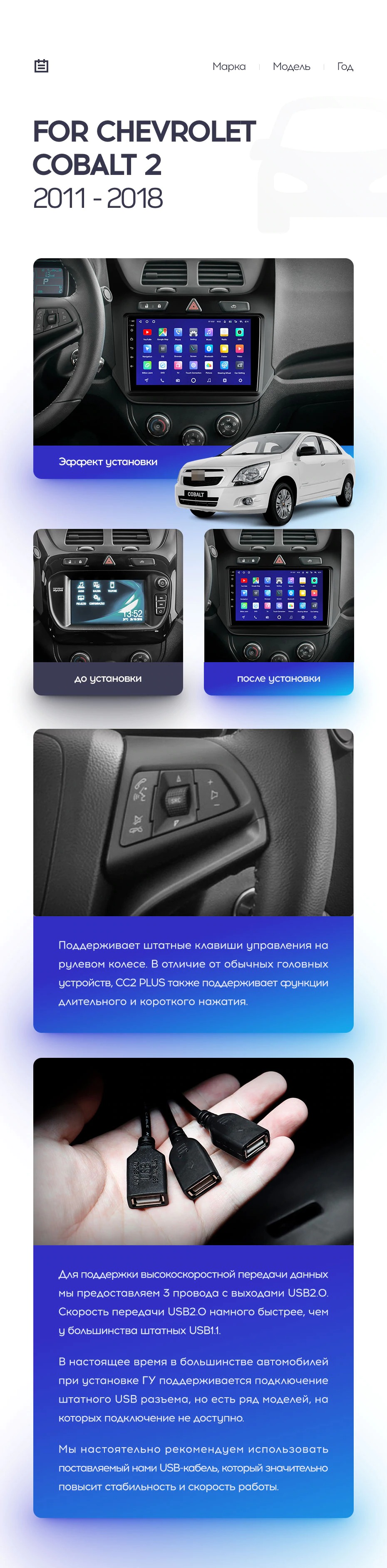 Установочный комплект для Chevrolet Cobalt 2 (2011-2018) включает переходную рамку и проводку.