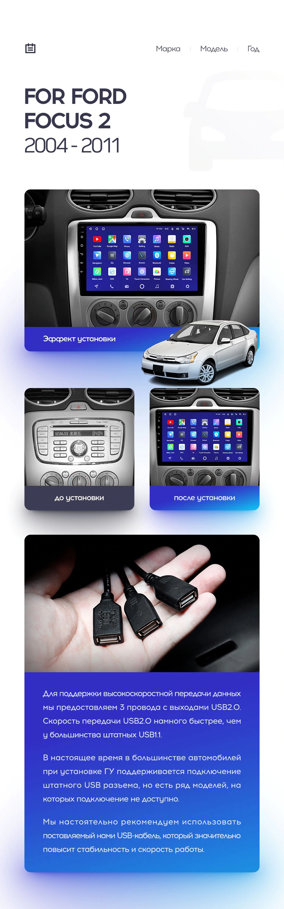 Полный комплект установки магнитолы Teyes с рамкой и проводкой можно выбрать в каталоге штатных магнитол Ford Focus 2 Mk 2 (2005-2010).