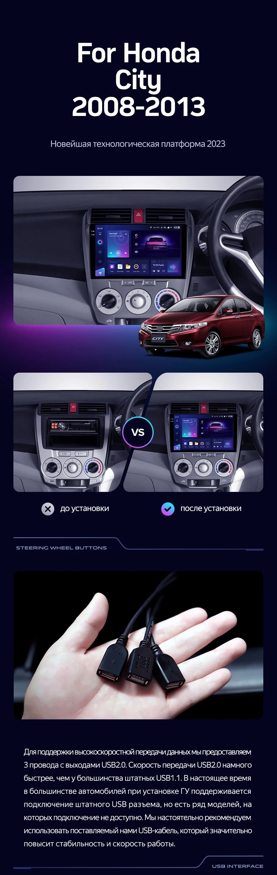 Полный комплект установки магнитолы Teyes с рамкой и проводкой можно выбрать в каталоге штатных магнитол Honda City (2008-2013).