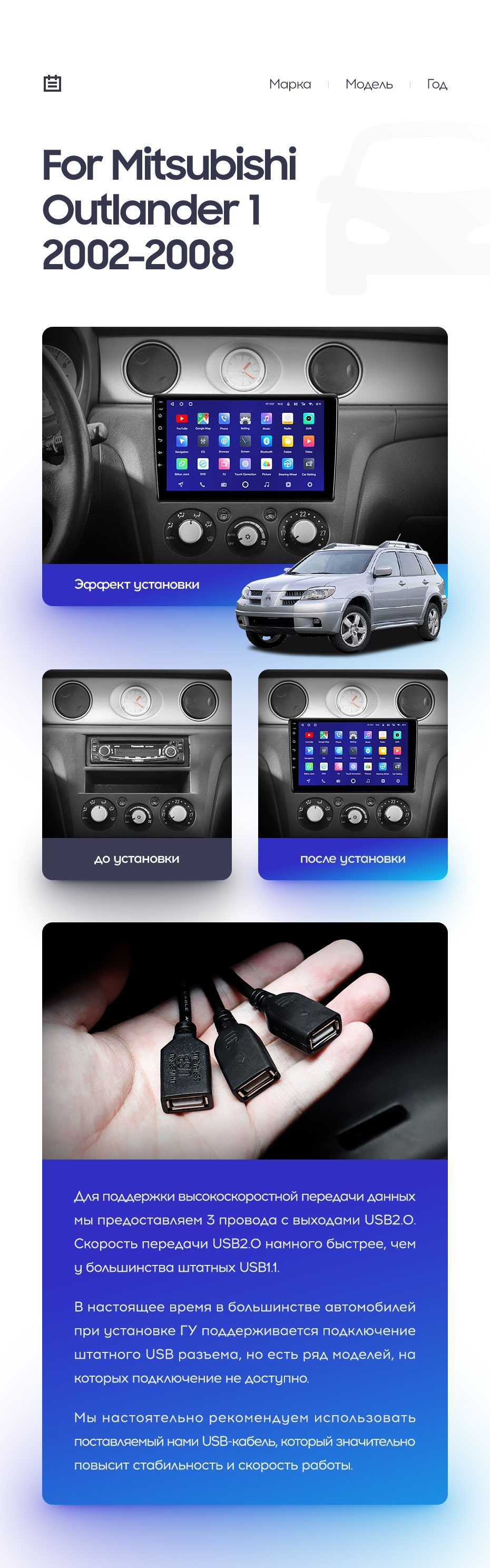 Установочный комплект для Mitsubishi Outlander 1 (2002-2008) включает переходную рамку и проводку.