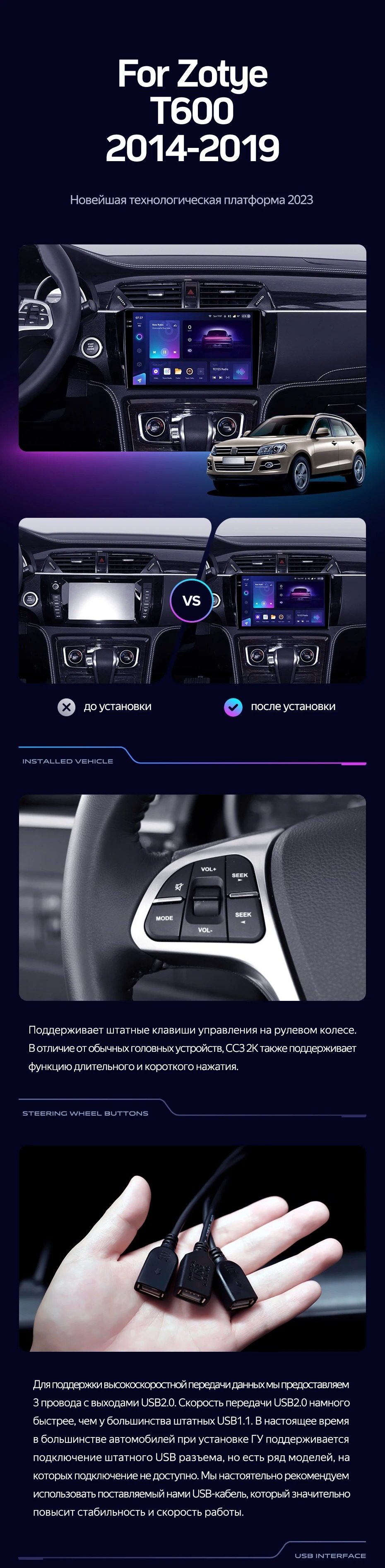 Полный комплект установки магнитолы Teyes с рамкой и проводкой можно выбрать в каталоге штатных магнитол Zotye T600 (2014-2019).